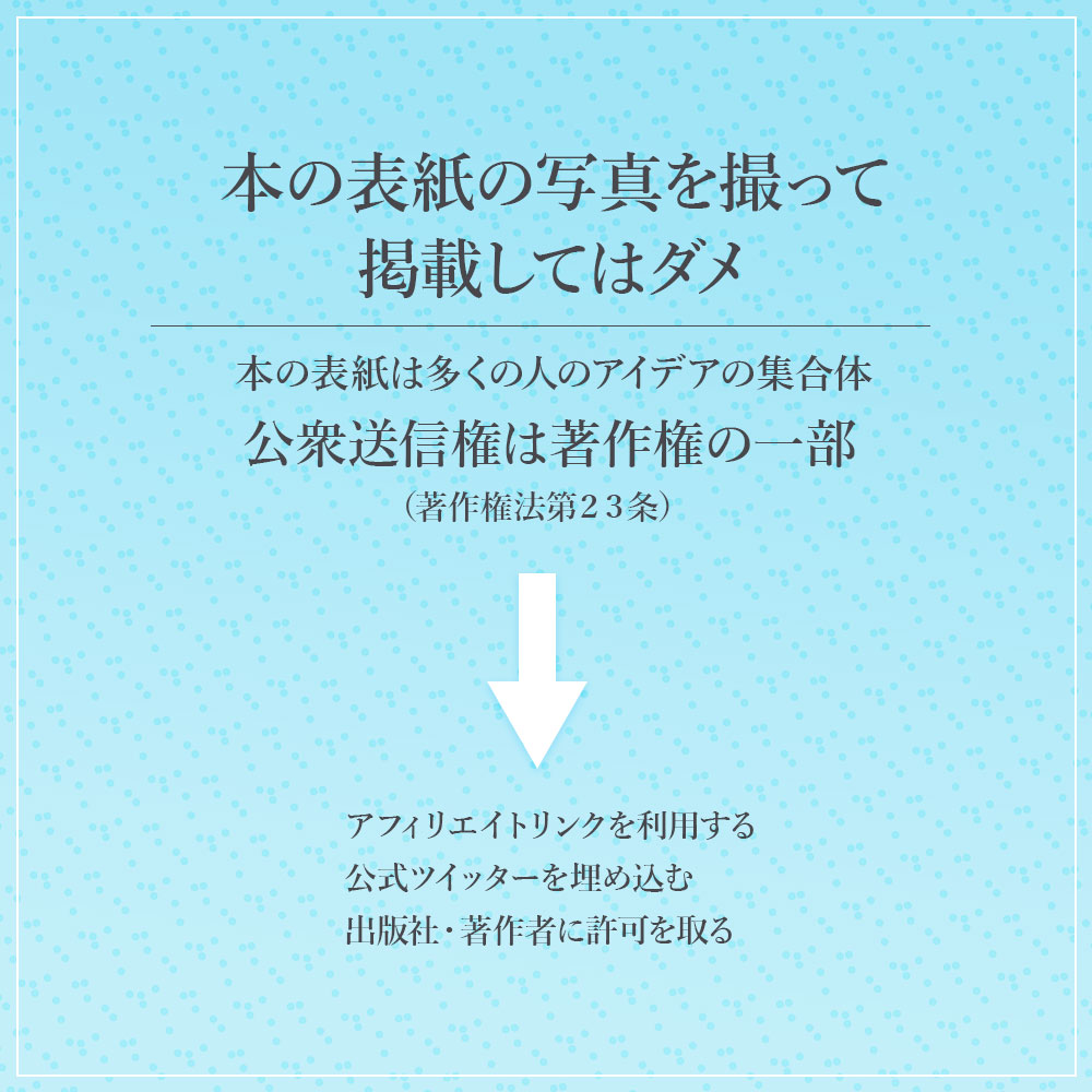 本の表紙の写真をSNSやサイトに勝手にUPするのは著作権法第23号に抵触するのでNGです。ただ宣伝になるため著者が黙認しているケースが多くグレーと言えるでしょう。私はこのサイトではAmazonのアフィリエイトリンクを使用しておすすめの本を紹介したいと思います。