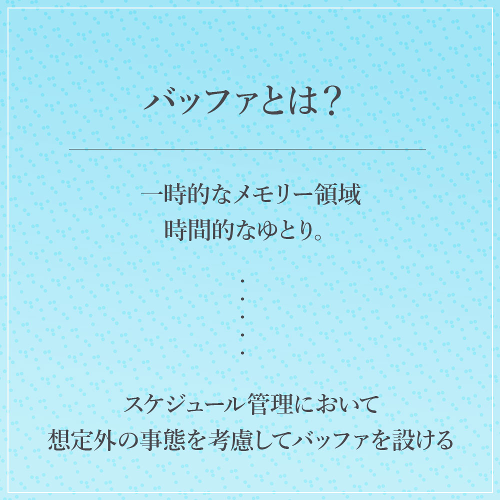 バッファとは一時的なメモリー領域のことで、時間的余裕も意味しています。時間効率化においてはバッファを取ることは必須となります。