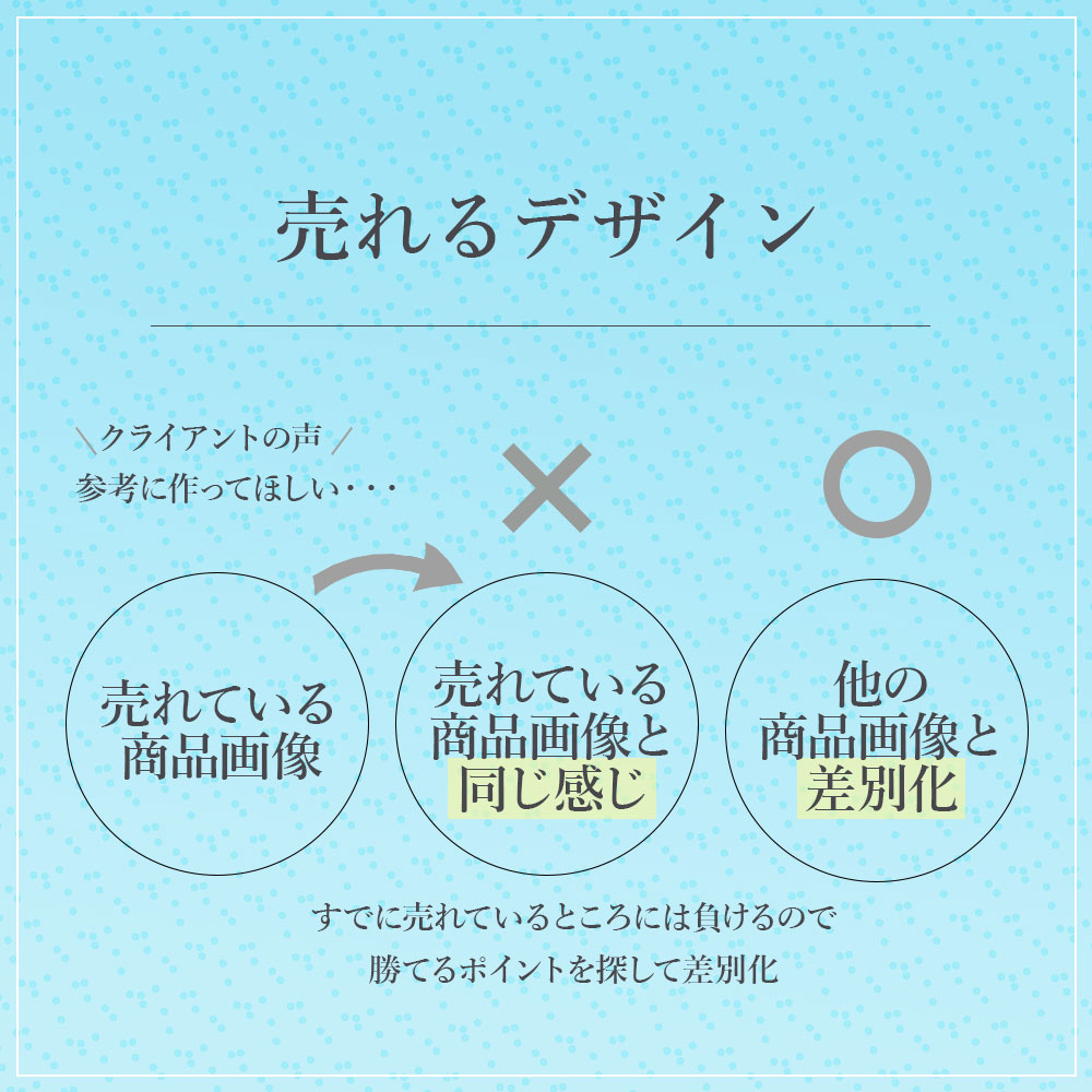 「売れているショップの画像のように作ってほしい」と言われることが良くあります。全く同じようなテイストで作成するとクライントに喜ばれます。