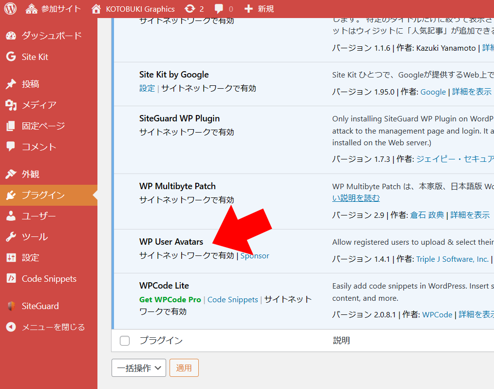 色々調べてみたら、「WP User Avatar」は使いにくいという声もあったみたいで、このプラグインは諦めることにしました。無駄な時間を省くために迷っていられません。サイトネットワーク管理でプラグインの無効化を設定。