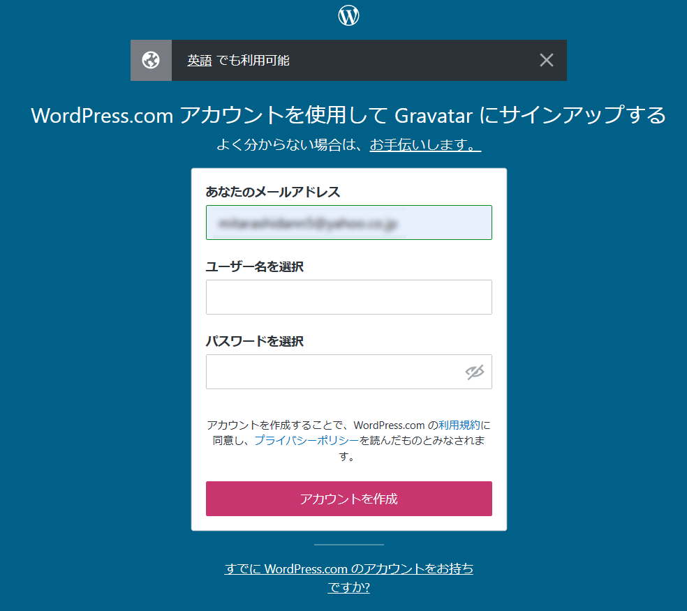 いきなりつまづきました。WordPressのアカウントって、WordPressのダッシュボードにログインするときのユーザー名やパスワードだと思っていました。心当たり全部NGだったので、新規で作成しました。