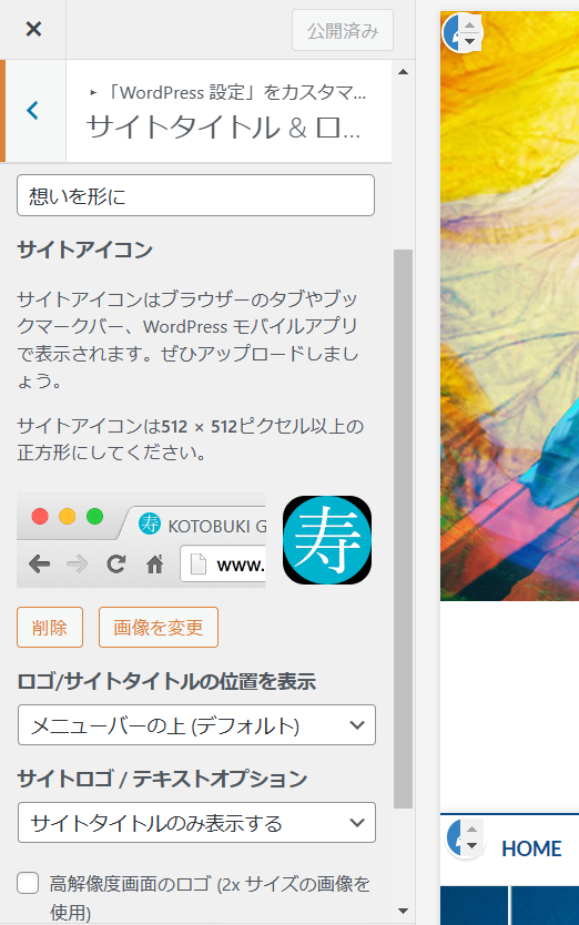 このサイトの管理画面でプロフィールを設定。画像をアップロードしたけど表示されません。特にサイズの指定は記載がなかったのですが、念のためファビコン用の画像(512×512)でもアップロード。