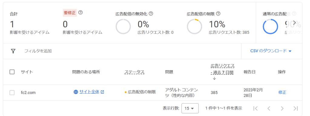 びっくりしました。心当たりのない広告配信の制限のメール。まず、アドセンスに登録した覚えのないfc2.comがあって気になっていました。今回はこのfc2.comを削除したいので調べて実行したことを記録します。