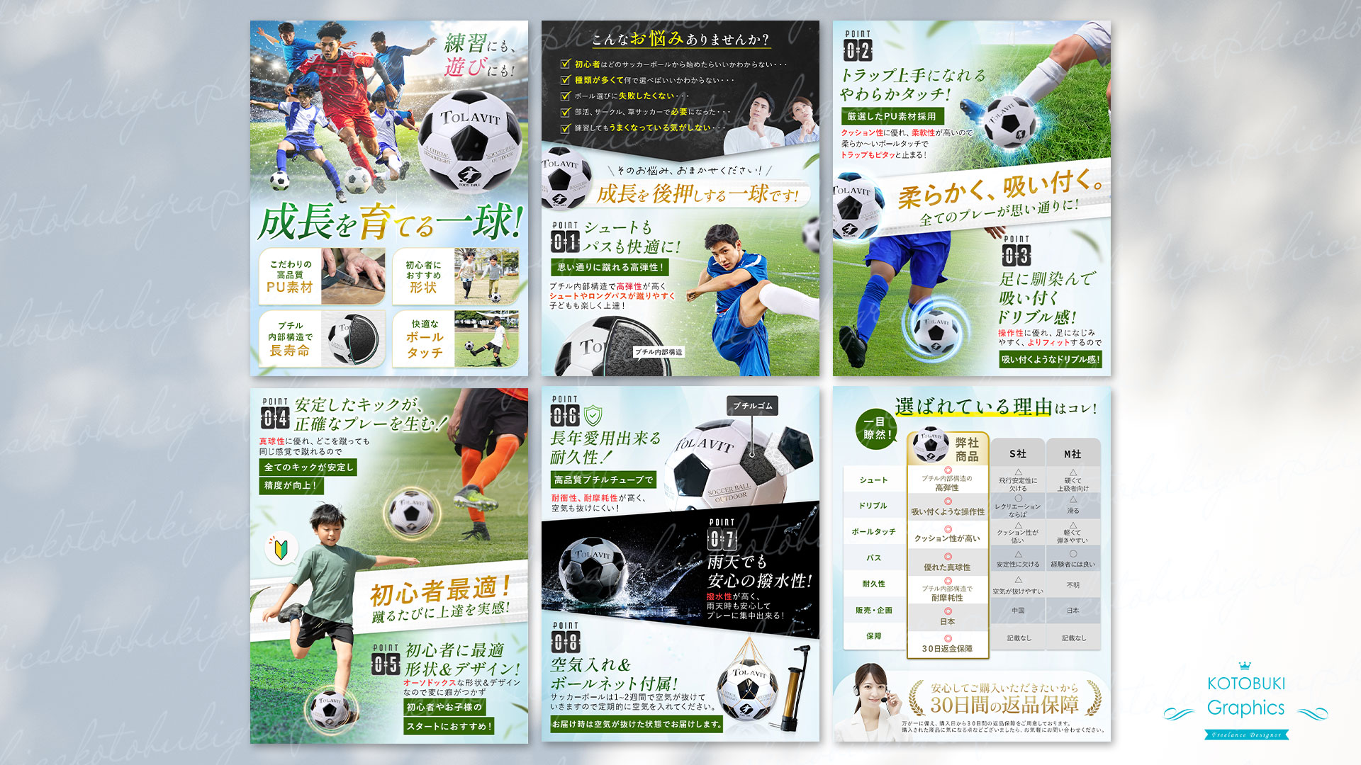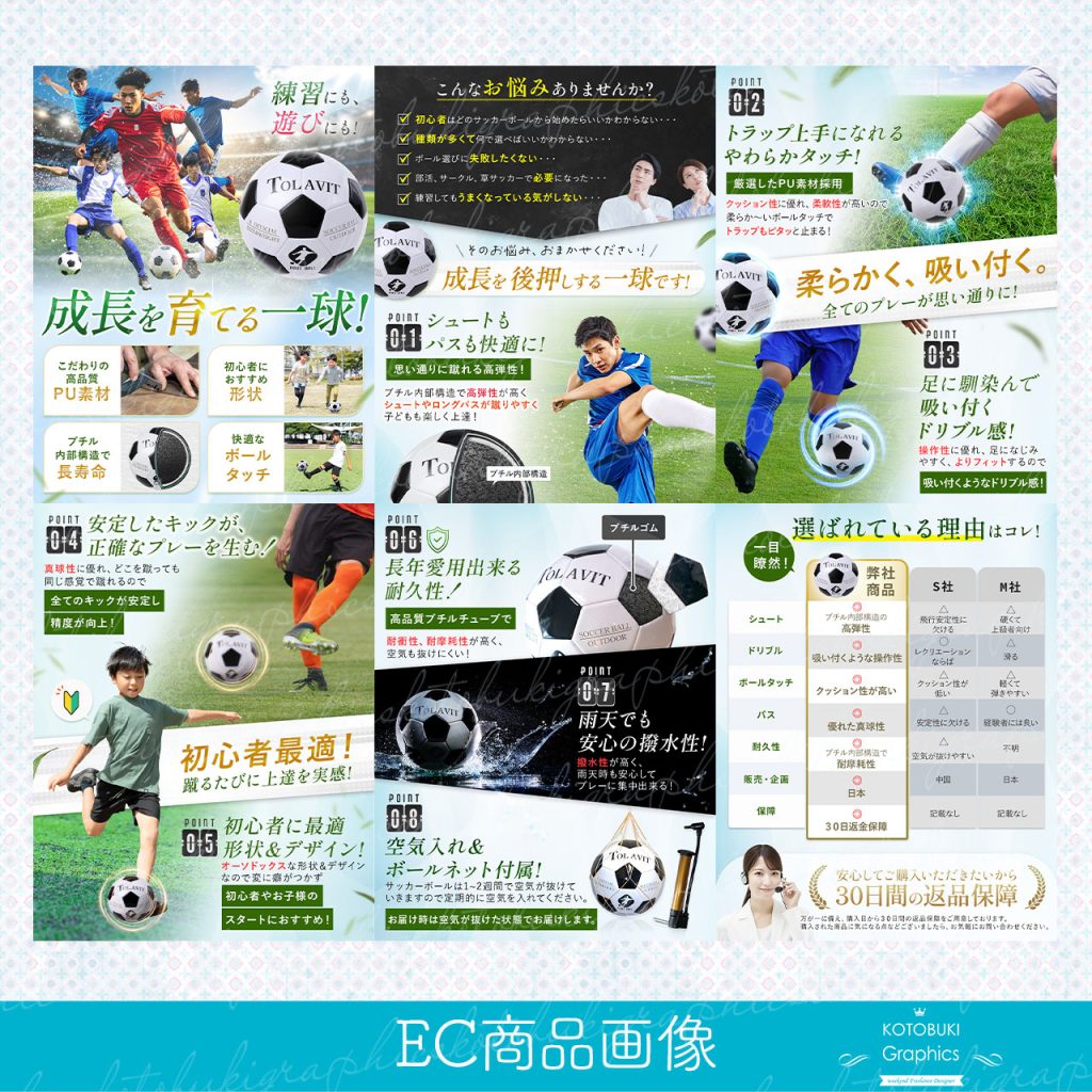 1枚目にメイン画像はポスター画像のようにプレイするサッカー選手を合成させていただきました。