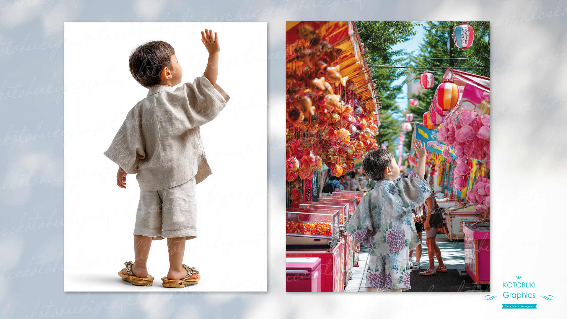 Midjyorneyで生成した無地の甚平に、指定の柄を合成しさらに夏祭り背景に合成しました。