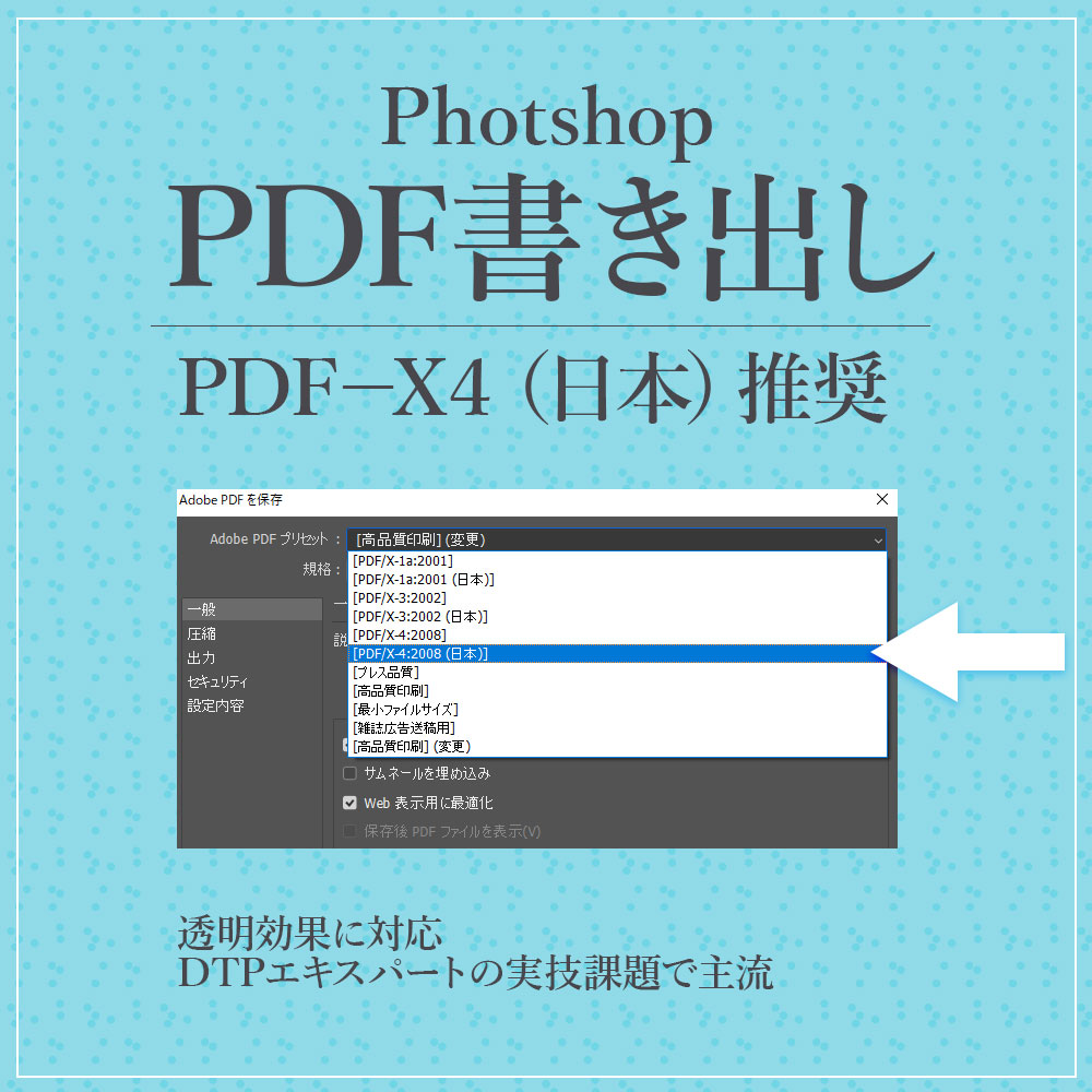 調べたところによると、DTPエキスパートの試験でもPDF-X4が主流になっているとのこと。透明効果に対応できるようになったんですね。PhotoshopでのPDF書き出しで迷ったらPDF-X4(日本)を選んでください。