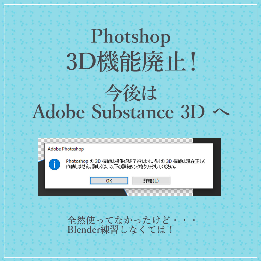 Photoshopの3D機能が廃止になります。現在のバージョンでは正常に機能しない旨の警告が表示されます。どうしても使いたい場合はPhotoshop22.2を使えば正常に3D機能が使えるそうです。今後の3DはSubstance ラインへ移行するとのこと。